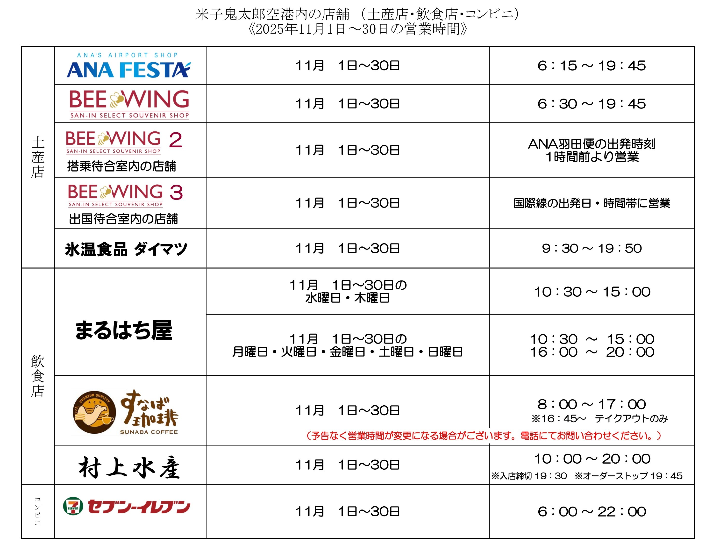 館内飲食店・物販店の営業時間は以下の通りでございます。