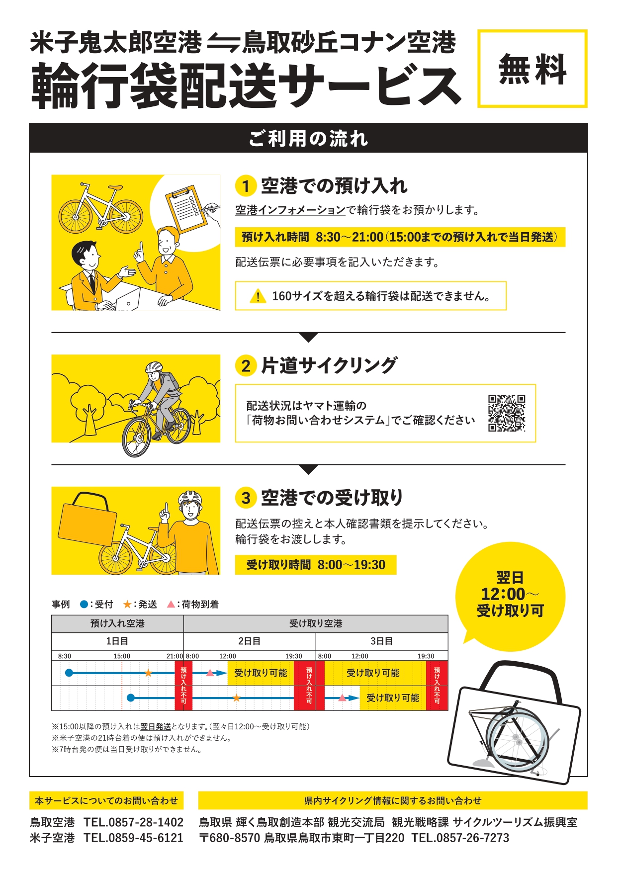 ・米子鬼太郎空港及び鳥取砂丘コナン空港の7時台発の便は、当日輪行袋の受け取りができませんので、ご注意ください。